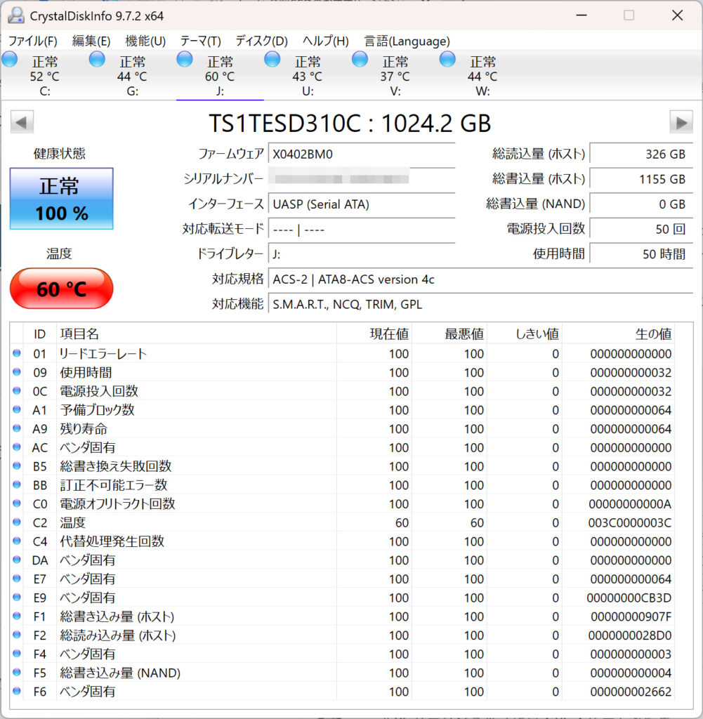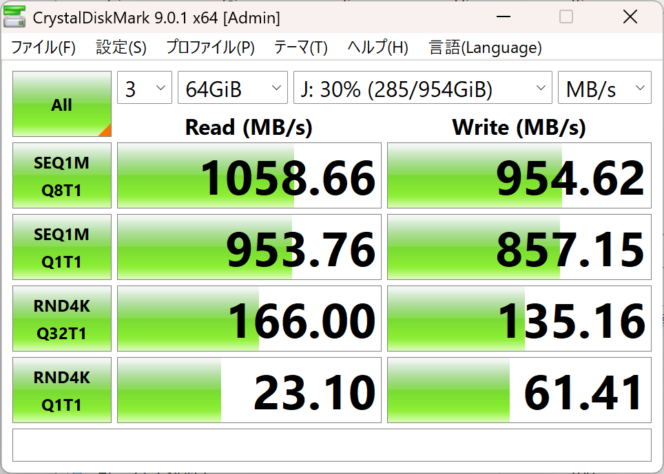 ESD310 1TBモデルをCrystalDiskMarkで計測したところ、30%ほど容量を使った状態でReadが1050MB/s, Writeが950MB/sとメーカー公称値通りの性能が出ていました。